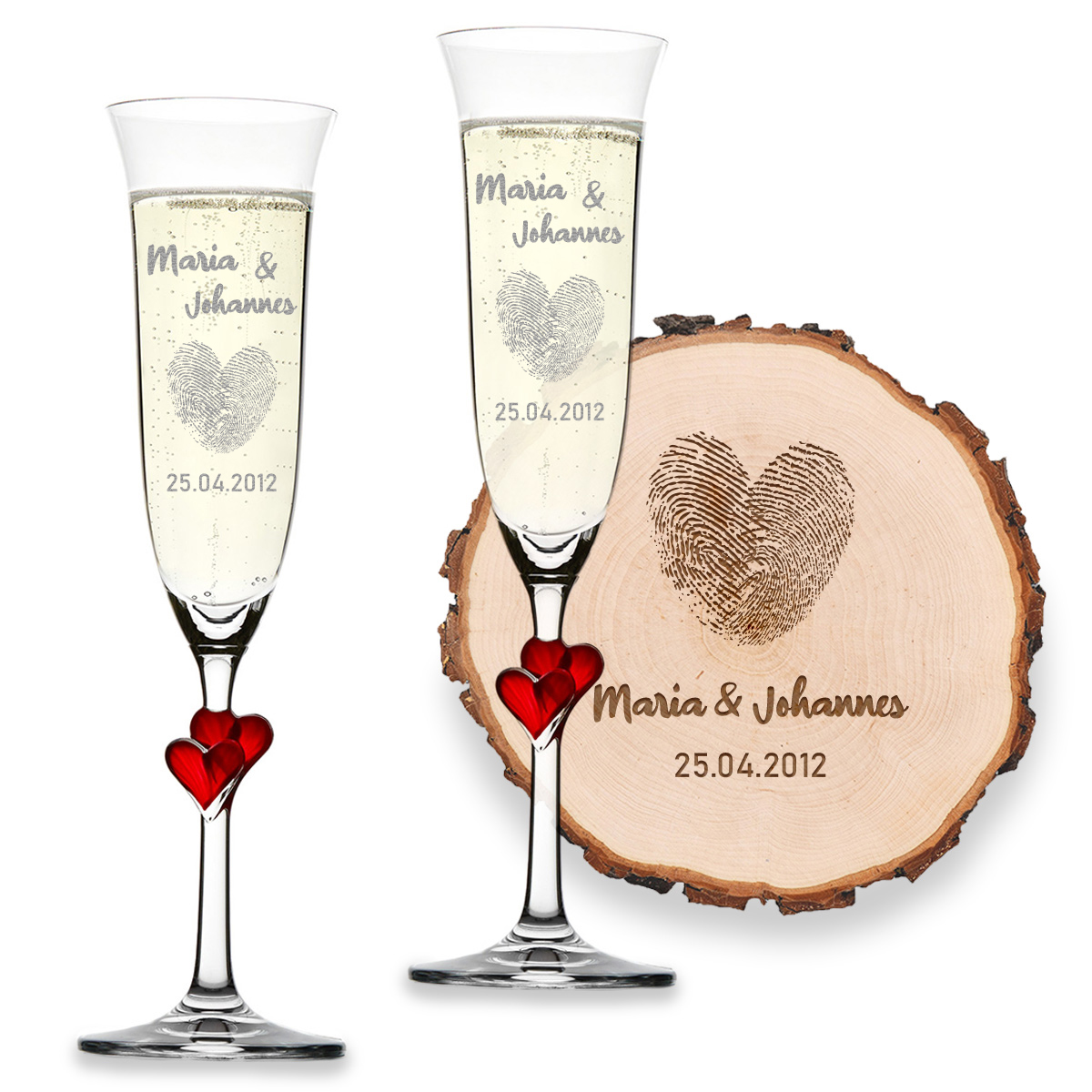 Es handelt sich hierbei um ein wunderschönes Geschenkset zur Hochzeit mit 1x Baumscheibe aus echtem Erlenholz und 2x gravierte Sektgläser mit handbemalten roten Herz. Dieses besondere Set ist das Geschenk für eine Hochzeit, Jahrestag oder andere besondere Momente.