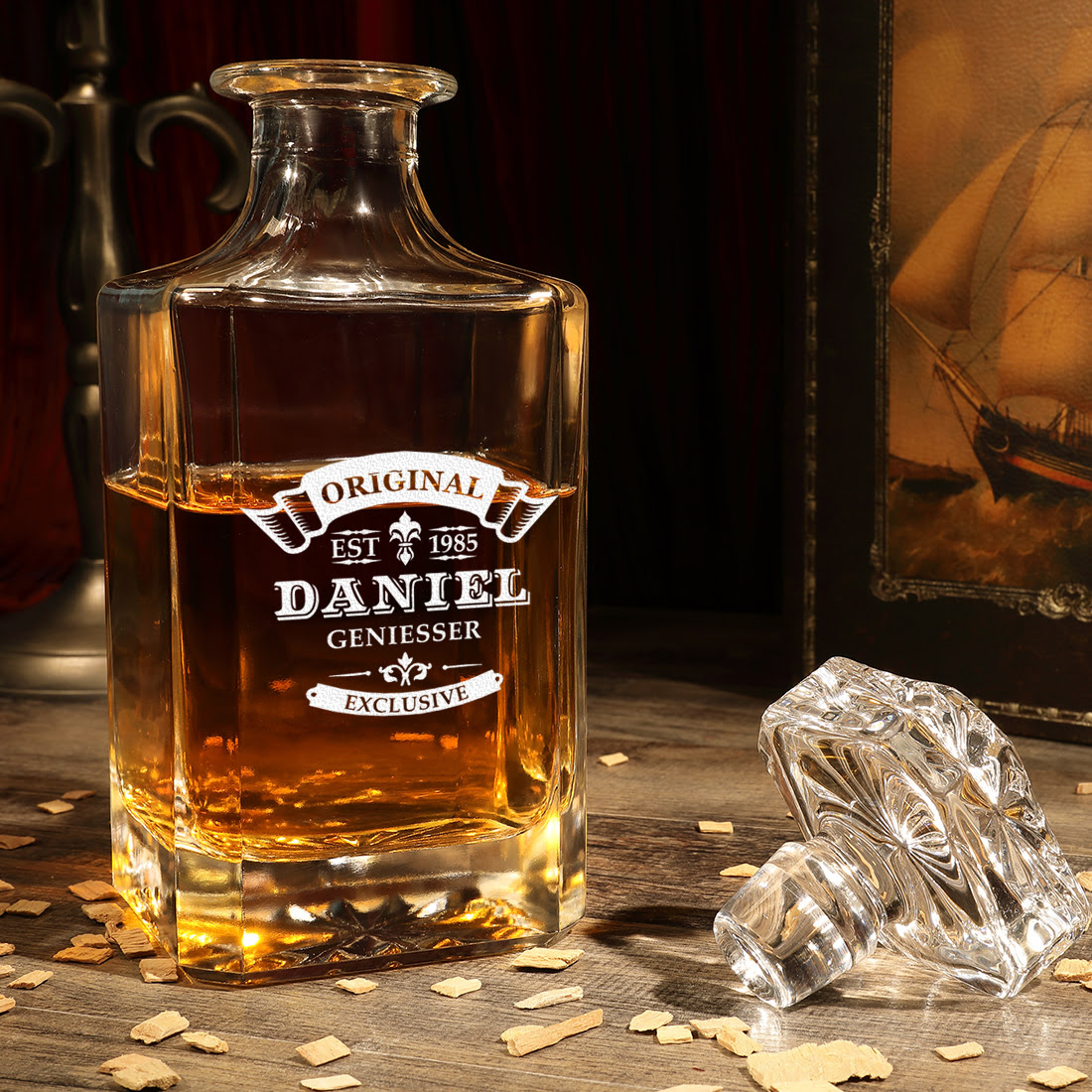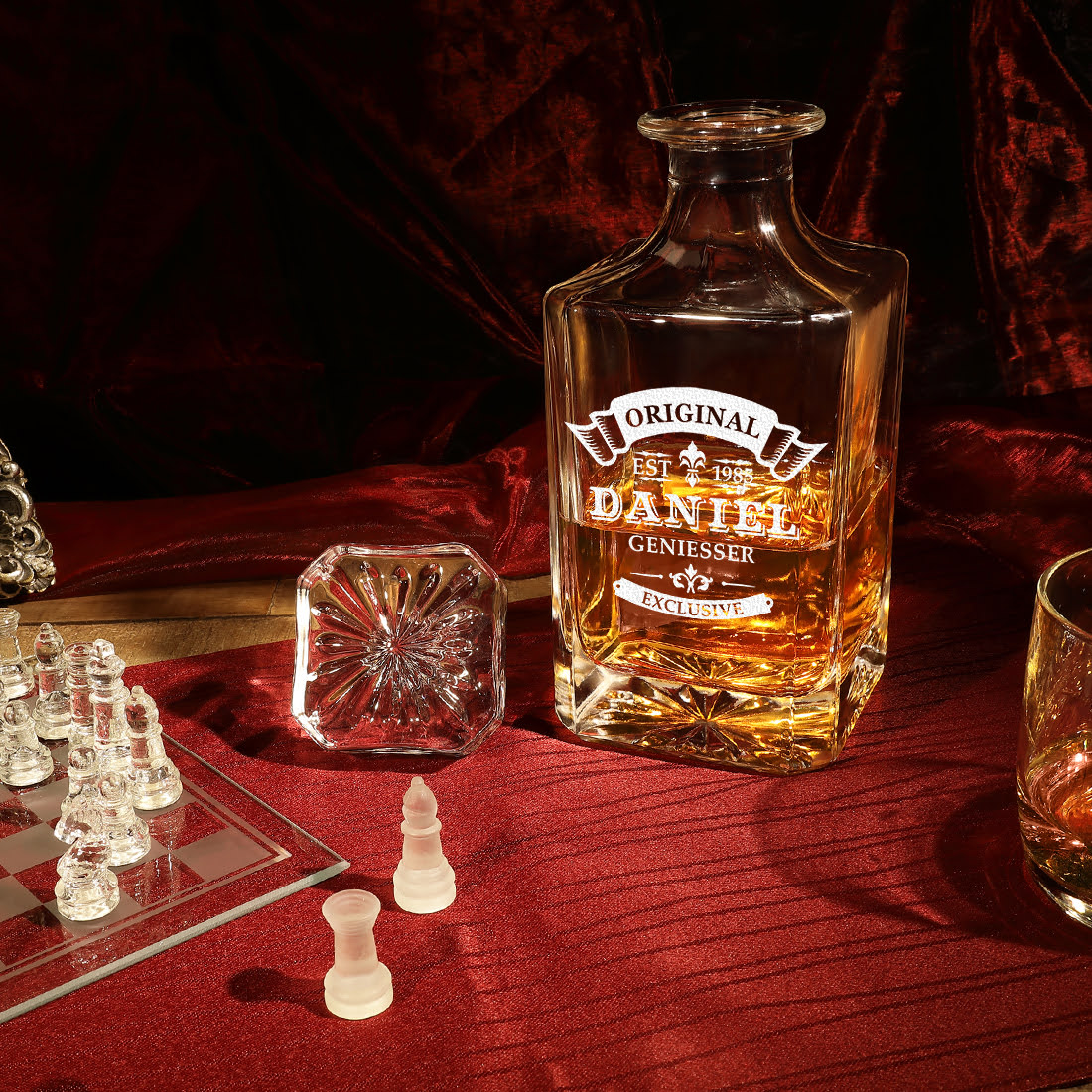 Du hast die Wahl. Den Whisky Dekanter kannst du alleine oder als Geschenkset mit einem oder mehreren personalisierten Whiskygläsern kaufen.