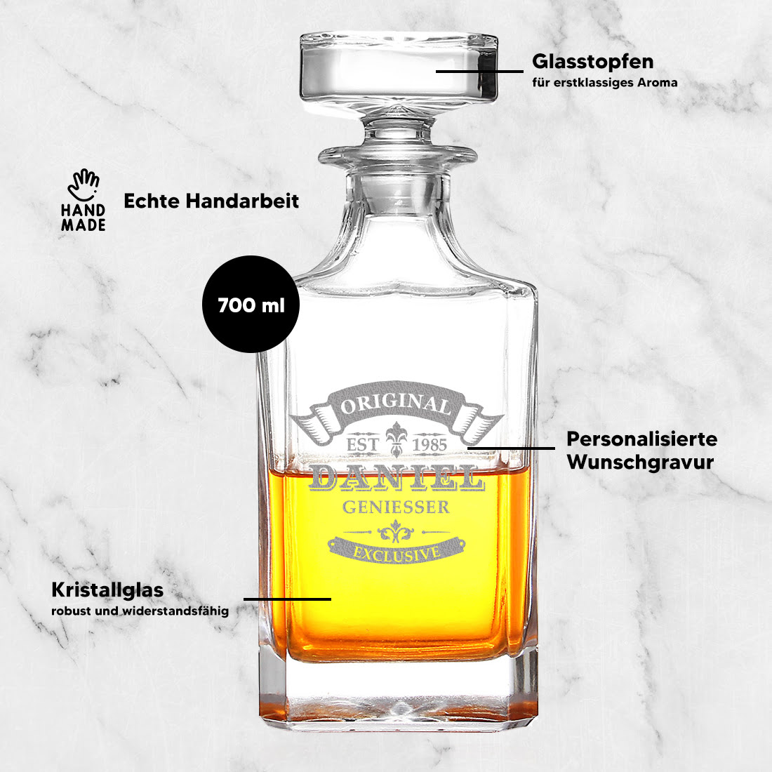 Die Karaffe und die Whiskygläser kannst Du durch unseren besonderen Service mit einer personalisierten Wunschgravur versehen. Du erhältst definitiv ein einzigartiges Geschenk, das perfekt zu Deinen Bedürfnissen und ästhetischen Vorlieben passt. Gerade für Whisky, Scotch, Bourbon und Rum eignet sich dieses Whisky-Dekanter-Set perfekt. Das Aroma bleibt stets durch den luftdichten Glasstopfen erhalten. Das große Fassungsvermögen von 700 ml bietet ausreichend Platz, um herkömmliche Spirituosen und Getränke einzufüllen.