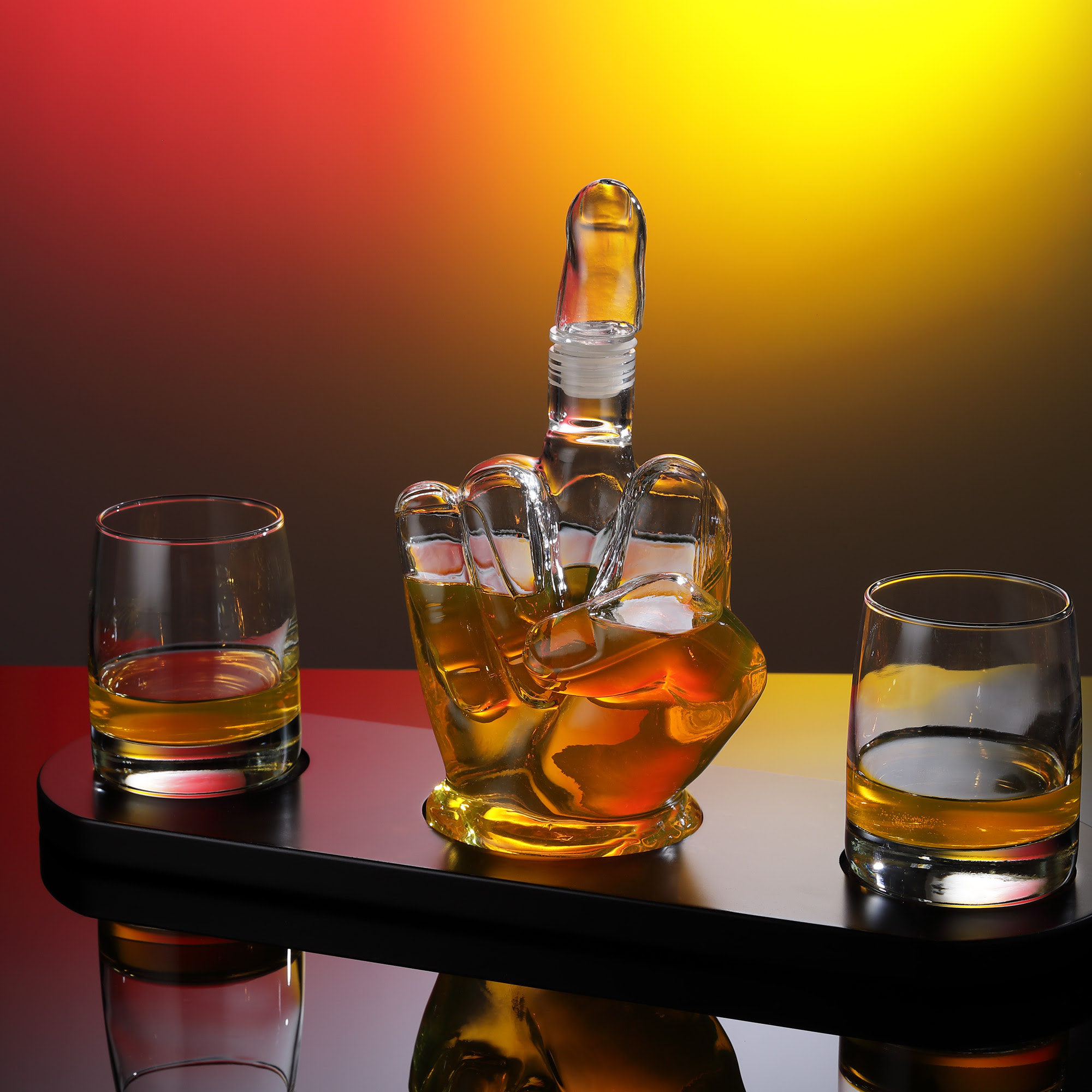Das Whisky Geschenkset überzeugt besonders durch die besondere Form des Dekanters. Die Karaffe tritt als Mittelfinger in Erscheinung und ist somit besonders einzigartig.