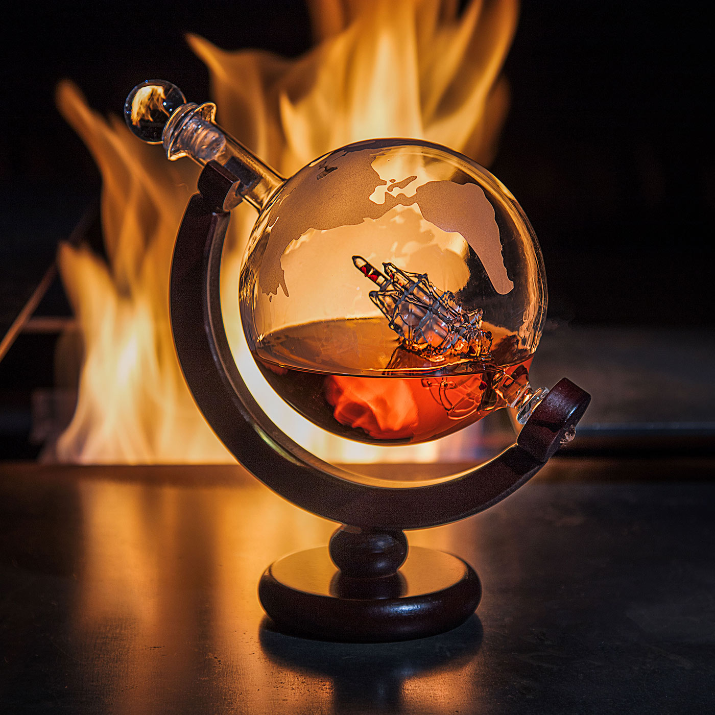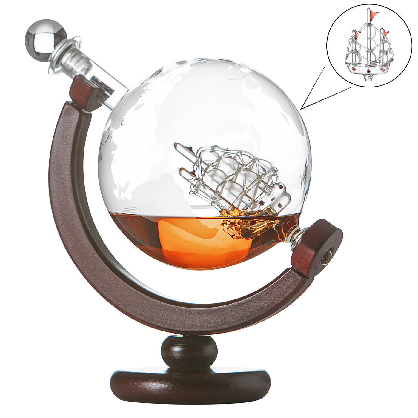 Mit dieser Whisky-Flasche werden Sie ein Geschenk überreichen, dass alle anderen Präsente übertreffen wird. Diese Flasche ist etwas ganz Besonderes. Die mundgeblasene Kugel stellt beim genaueren Hinsehen einen Globus dar. Die Flasche liegt sicher und optisch sehr ansehnlich auf einem Holzgestell. In der Globuskaraffe selbst befindet sich ein Segelschiff aus Glas. Detailgetreu und edel liegt das Schiff im Inneren und segelt durch den köstlichen Whisky.