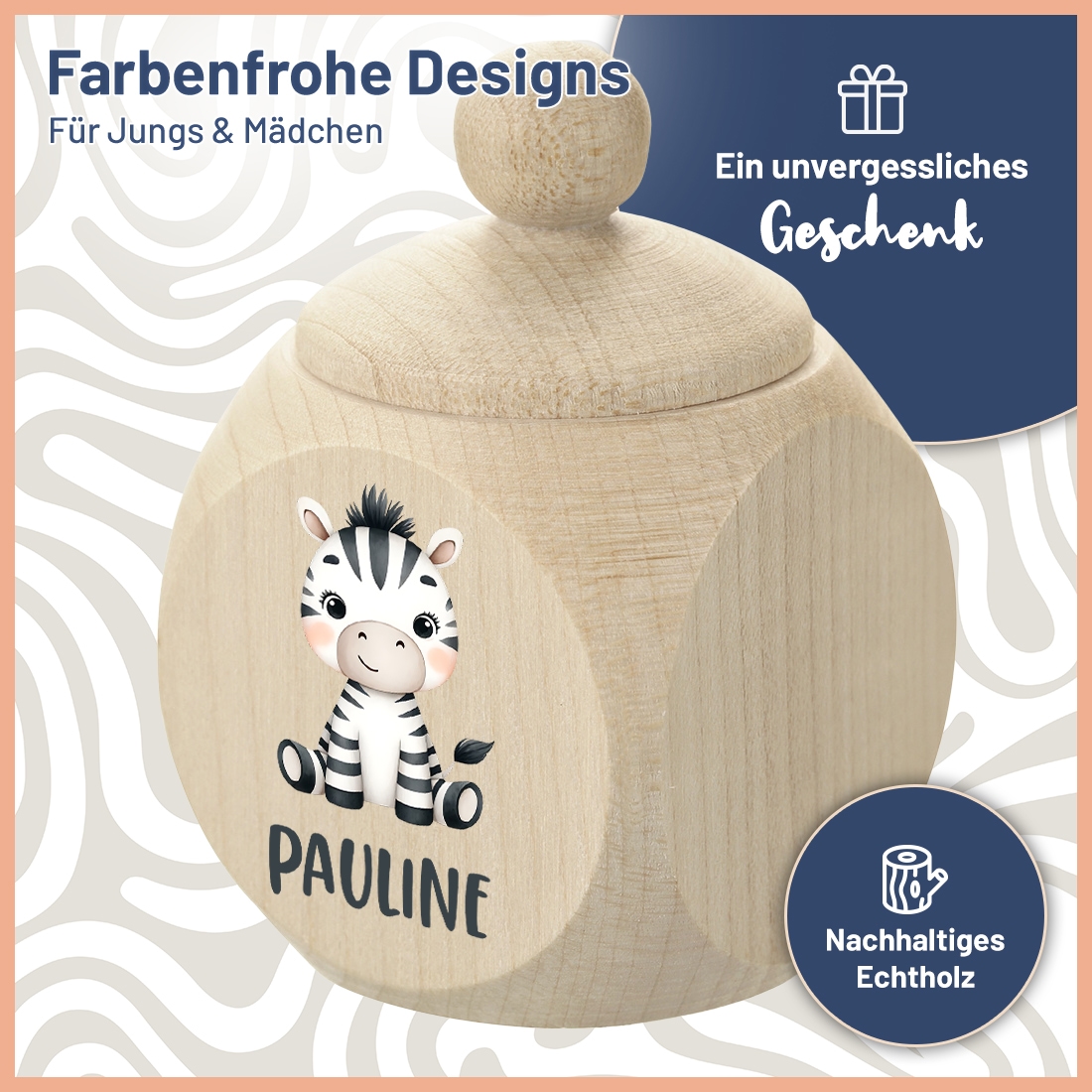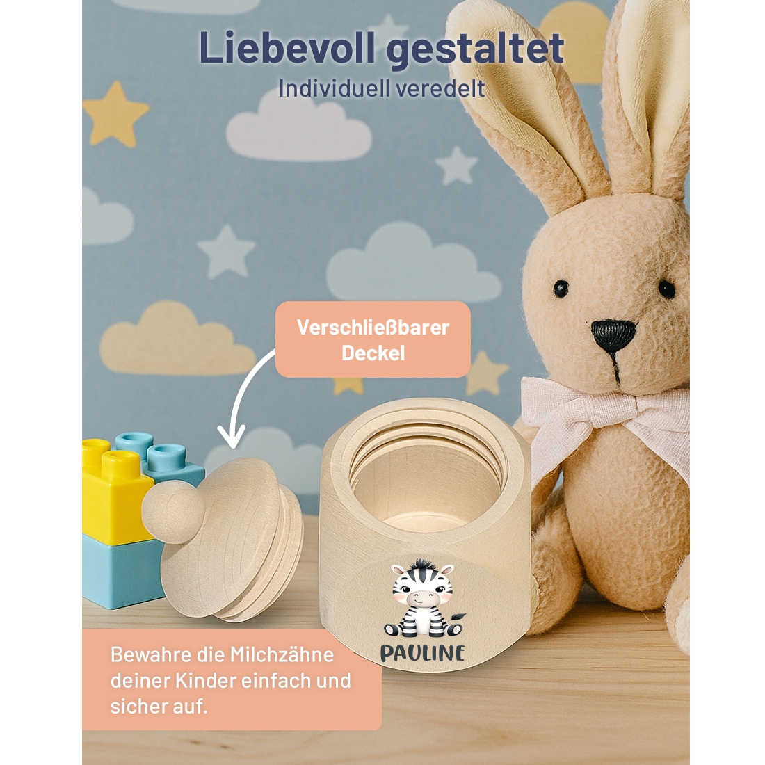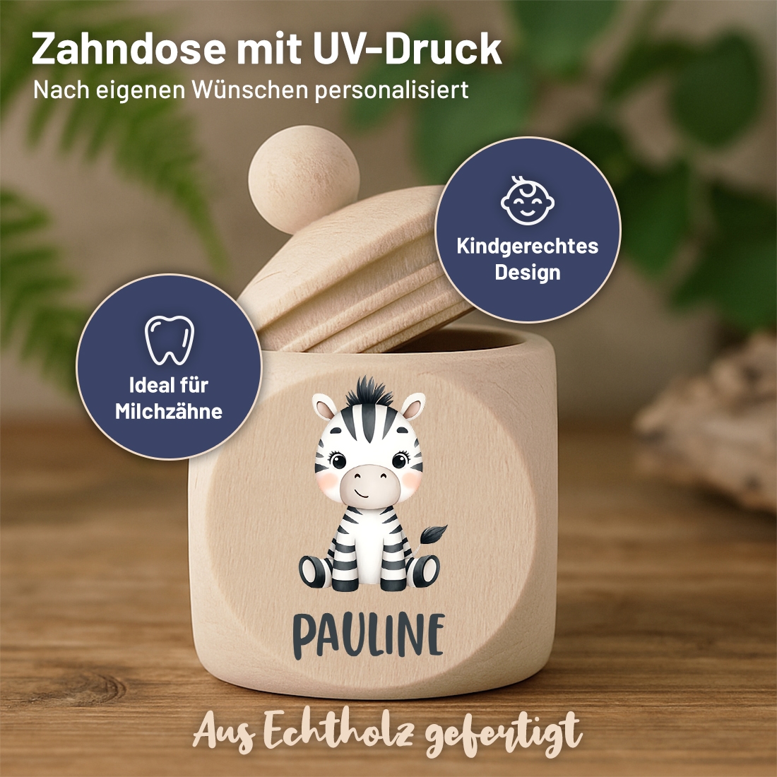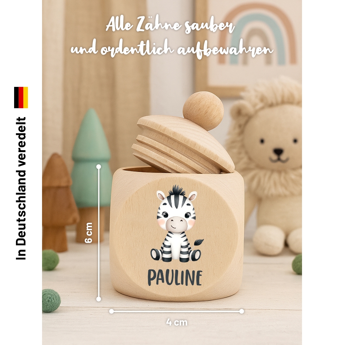 Zahndose aus Holz für Kinder – personalisierbar mit bunten Tier-Motiven