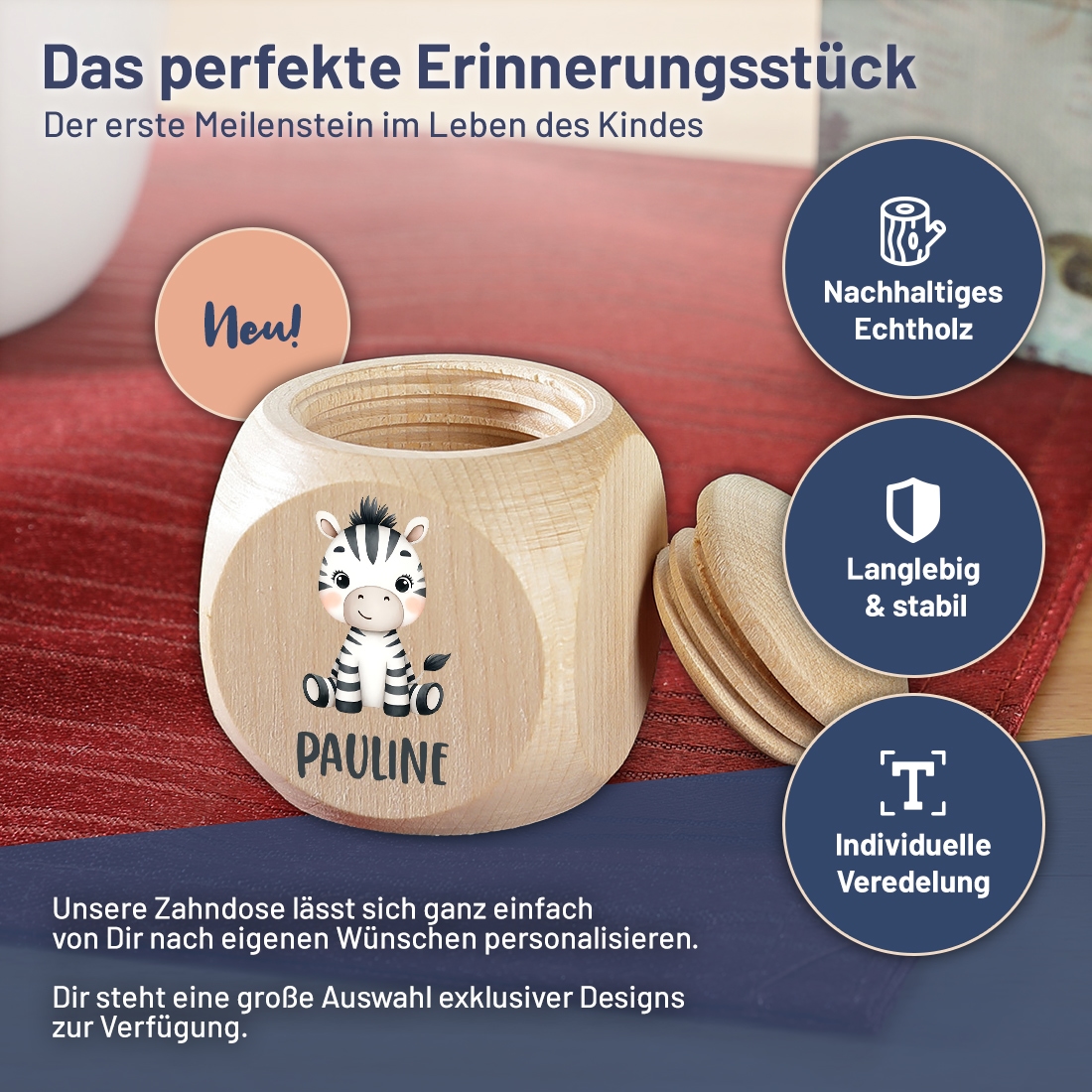 Die erste Zahnlücke ist für jedes Kind ein kleines Abenteuer – und die ausgefallenen Milchzähne sind wertvolle Erinnerungsstücke an diese besondere Zeit. Mit unserer Zahndose aus hochwertigem Holz können Eltern die kleinen Zähnchen sicher und stilvoll aufbewahren.