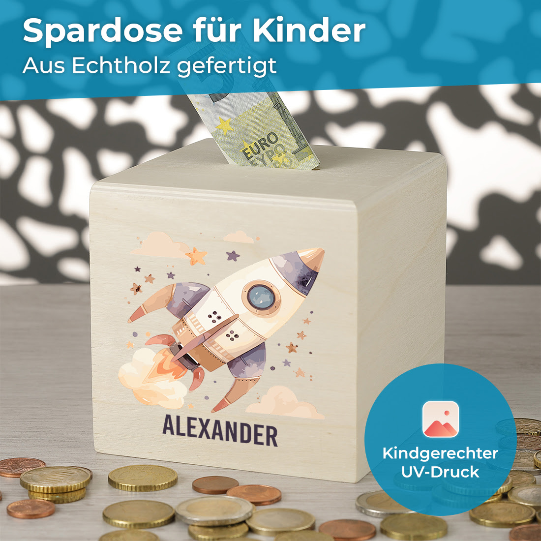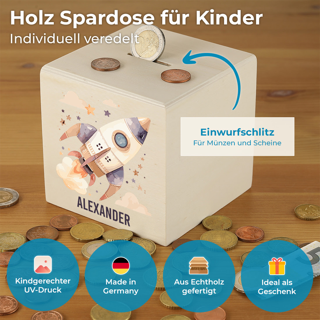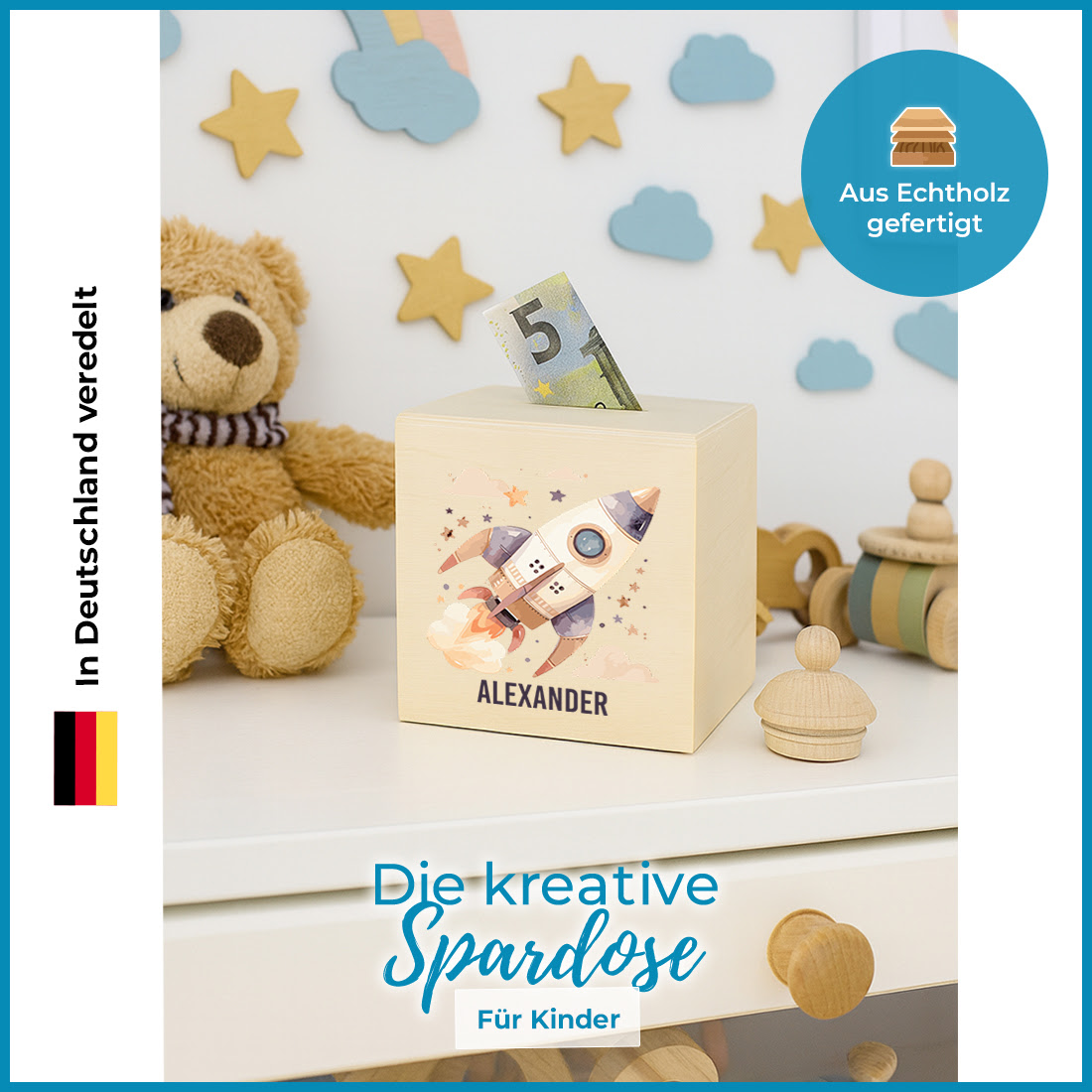 Die Kombination aus natürlichem Holz, strahlenden Farben und der Namensaufdruck macht jede Spardose zu einem echten Unikat. Sie eignet sich perfekt als Geschenkidee für Mädchen und Jungen, zur Geburt, Taufe, Kommunion, Einschulung oder einfach als liebevolle Aufmerksamkeit zwischendurch.