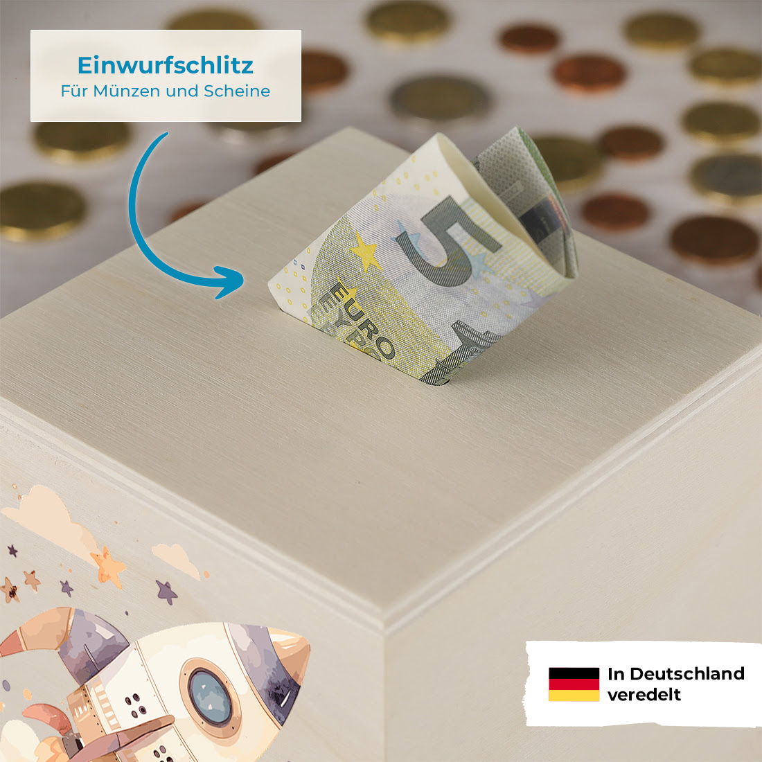 Unsere Spardose aus Holz ist mehr als nur ein Platz für Münzen und Scheine – sie ist ein Erinnerungsstück fürs Leben. Kinder lernen spielerisch den Wert des Sparens kennen und haben gleichzeitig ein dekoratives Highlight im Kinderzimmer.