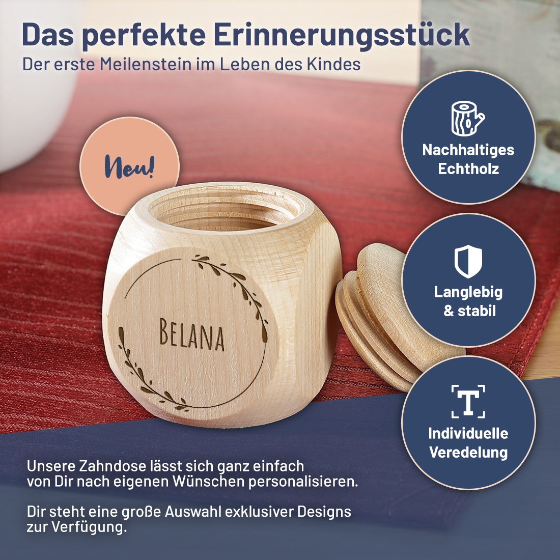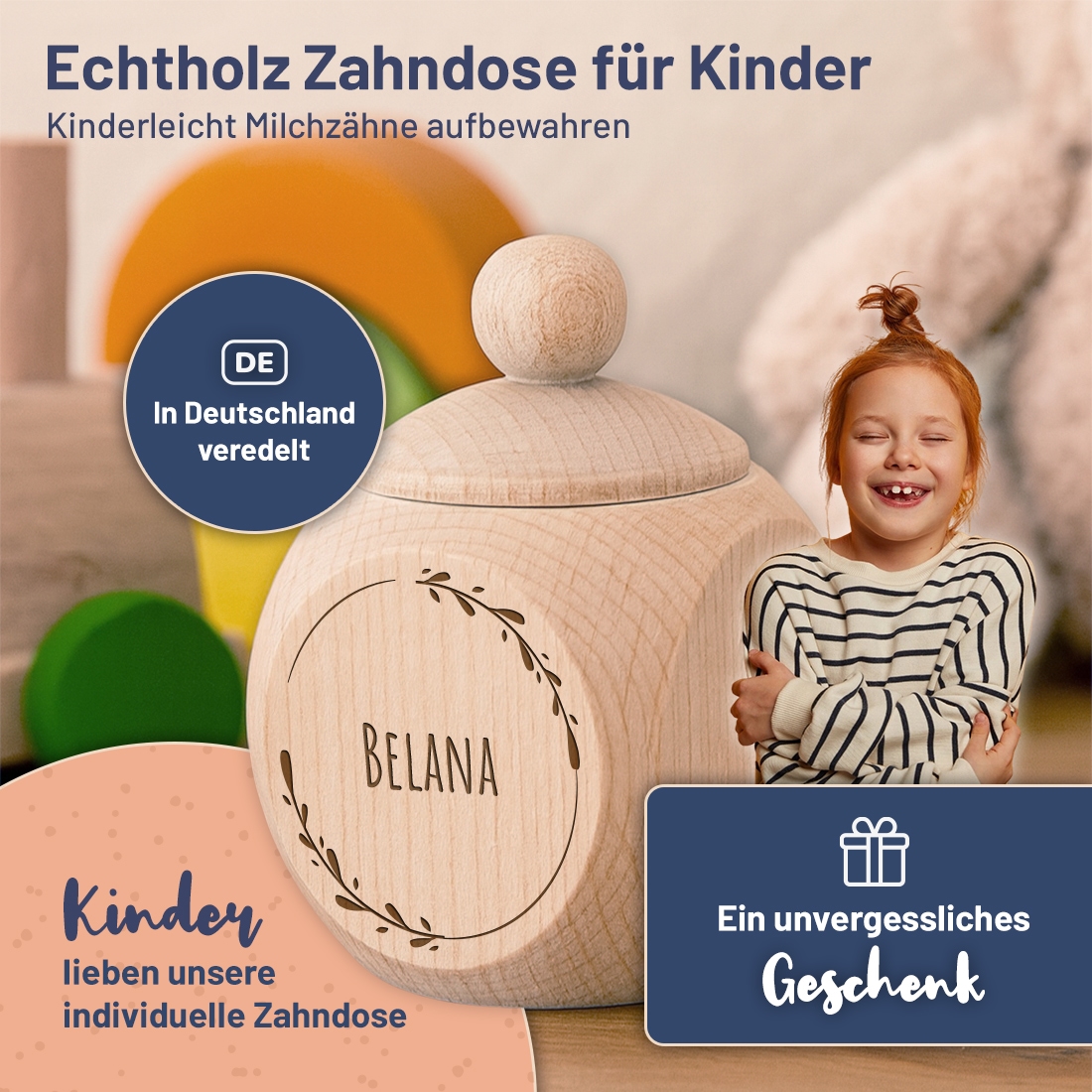 Die erste Zahnlücke ist für jedes Kind ein kleines Abenteuer – und die ausgefallenen Milchzähne sind wertvolle Erinnerungsstücke an diese besondere Zeit. Mit unserer Zahndose aus hochwertigem Holz können Eltern die kleinen Zähnchen sicher und stilvoll aufbewahren.