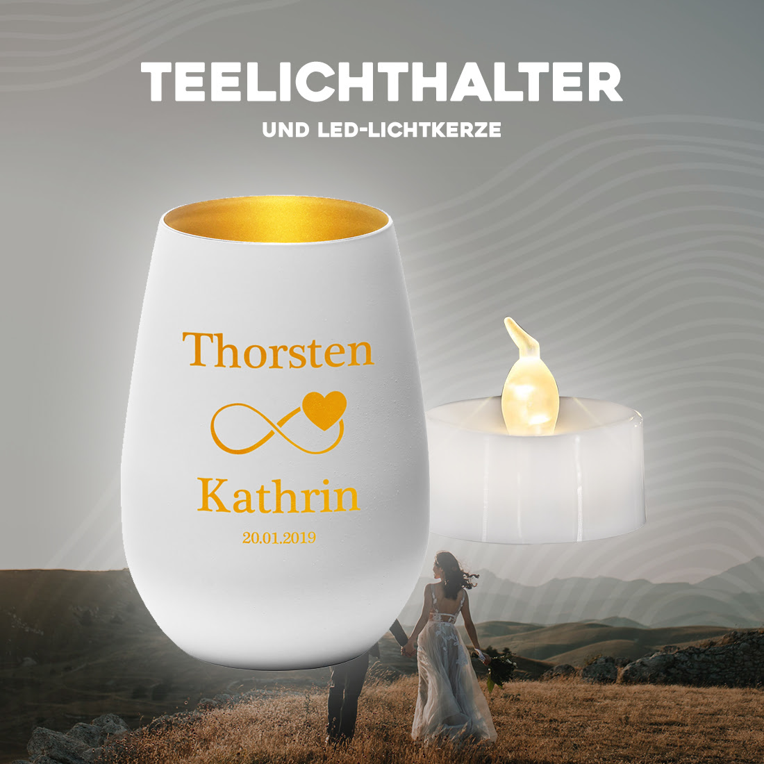 - Mit Personalisierung: Das Teelicht kann je nach Motiv von Dir mit einem Namen und Datum versehen werden.