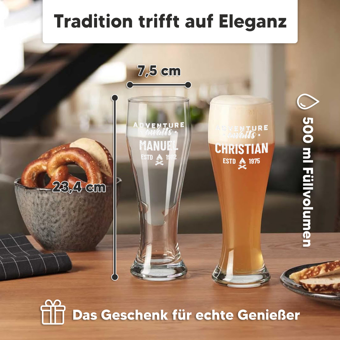 Verschenke etwas Außergewöhnliches und personalisiere das Weizenglas mit einer individuellen Gravur nach Wunsch. Das Weizenglas bekommt dadurch einen ganz eigenen Charakter und wird so zu einem unvergesslichen Geschenk. Perfekt für jeden Bierliebhaber.