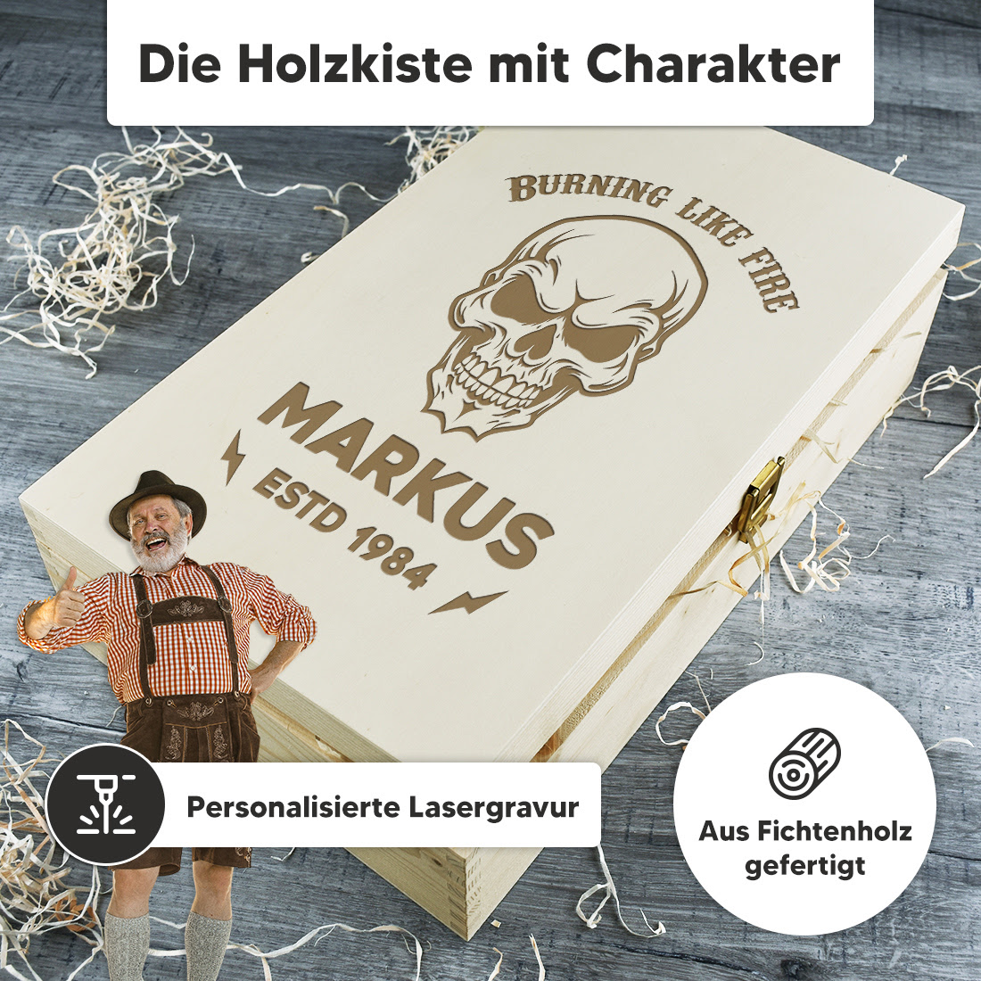 Die im Geschenkset enthaltene Holzkiste wird ebenfalls mit der von dir bestimmten Gravur versehen. Sie bietet nicht nur genügend Platz für die Aufbewahrung deiner schönsten Erinnerungsstücke, sondern ist auch eine wunderschöne Dekoration für dein Zuhause. Egal in welchem Raum, diese Kiste unterstreicht deine vorhandene Einrichtung.